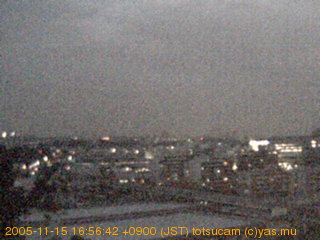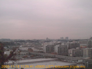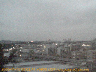 適度に曇った日の雲の動き (例: 2005-10-24) がとても楽しめます。 正面を横切っている高架は横須賀線下りです。 その下に横須賀線上り、東海道線、同貨物線が走っていますが、 高架に隠れていてよく見えません。 夜間は特に中央左寄りの車の動きがよく見えます。
