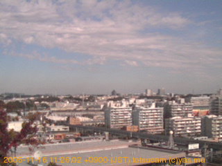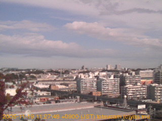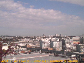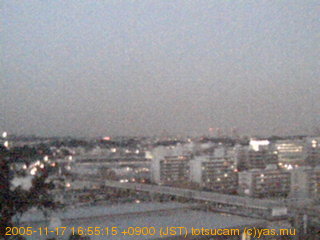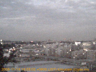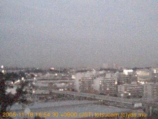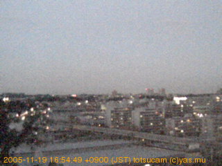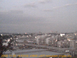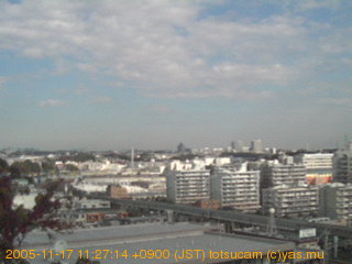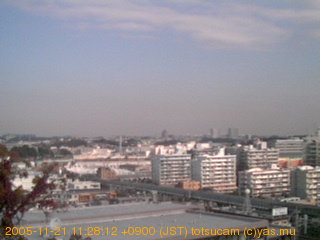 適度に曇った日の雲の動き (例: 2005-10-24) がとても楽しめます。 正面を横切っている高架は横須賀線下りです。 その下に横須賀線上り、東海道線、同貨物線が走っていますが、 高架に隠れていてよく見えません。 夜間は特に中央左寄りの車の動きがよく見えます。