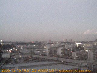 横浜市戸塚駅周辺から 東戸塚方面(北北東)を望む展望カメラの映像です。 左は現在の映像です。 下に並んでいるのは、 7日間に亘る日の出どき、昼間、夕暮れどきの写真(サムネイル)です。 それぞれ、日の出15分前、南中時、日没20分後の写真となっています。 各写真の下にはmpeg形式の動画へのリンクがあります。 それぞれ、日の出、南中、日没の前後1時間の画像です。 右欄にはその日24時間の動画へのリンクがあります。 この7日間以外は日付が一覧表示されています。 日付部分をクリックすると、 その日付から7日分が展開されて表示されます。