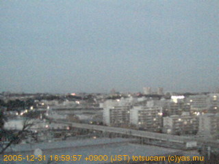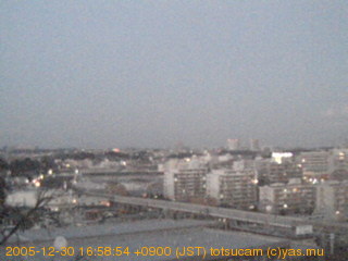 適度に曇った日の雲の動き (例: 2005-10-24) がとても楽しめます。 正面を横切っている高架は横須賀線下りです。 その下に横須賀線上り、東海道線、同貨物線が走っていますが、 高架に隠れていてよく見えません。 夜間は特に中央左寄りの車の動きがよく見えます。
