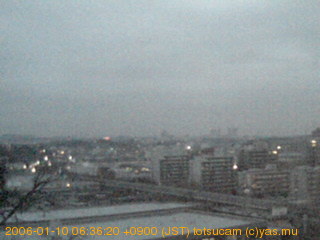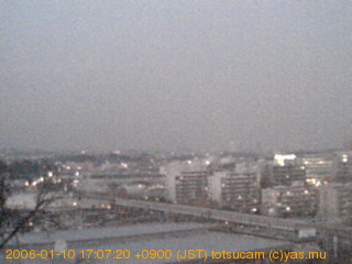 適度に曇った日の雲の動き (例: 2005-10-24) がとても楽しめます。 正面を横切っている高架は横須賀線下りです。 その下に横須賀線上り、東海道線、同貨物線が走っていますが、 高架に隠れていてよく見えません。 夜間は特に中央左寄りの車の動きがよく見えます。