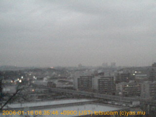適度に曇った日の雲の動き (例: 2005-10-24) がとても楽しめます。 正面を横切っている高架は横須賀線下りです。 その下に横須賀線上り、東海道線、同貨物線が走っていますが、 高架に隠れていてよく見えません。 夜間は特に中央左寄りの車の動きがよく見えます。