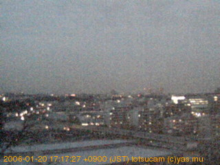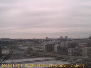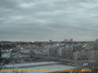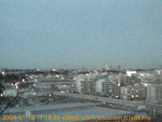 適度に曇った日の雲の動き (例: 2005-10-24) がとても楽しめます。 正面を横切っている高架は横須賀線下りです。 その下に横須賀線上り、東海道線、同貨物線が走っていますが、 高架に隠れていてよく見えません。 夜間は特に中央左寄りの車の動きがよく見えます。