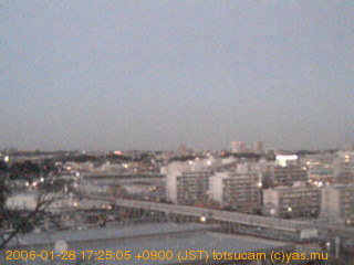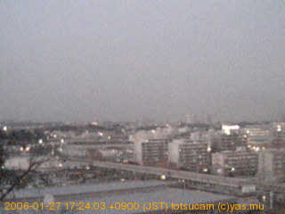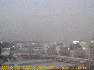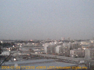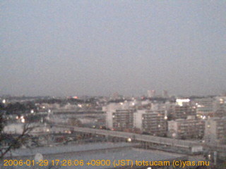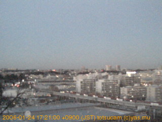 適度に曇った日の雲の動き (例: 2005-10-24) がとても楽しめます。 正面を横切っている高架は横須賀線下りです。 その下に横須賀線上り、東海道線、同貨物線が走っていますが、 高架に隠れていてよく見えません。 夜間は特に中央左寄りの車の動きがよく見えます。
