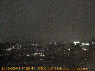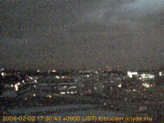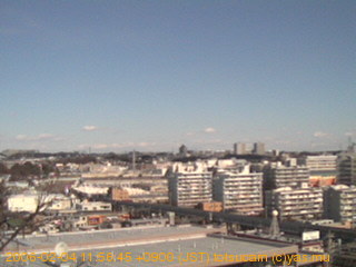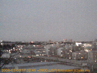 適度に曇った日の雲の動き (例: 2005-10-24) がとても楽しめます。 正面を横切っている高架は横須賀線下りです。 その下に横須賀線上り、東海道線、同貨物線が走っていますが、 高架に隠れていてよく見えません。 夜間は特に中央左寄りの車の動きがよく見えます。