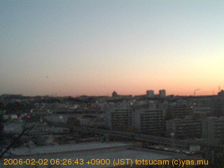 横浜市戸塚駅周辺から 東戸塚方面(北北東)を望む展望カメラの映像です。 左は現在の映像です。 下に並んでいるのは、 7日間に亘る日の出どき、昼間、夕暮れどきの写真(サムネイル)です。 それぞれ、日の出15分前、南中時、日没20分後の写真となっています。 各写真の下にはmpeg形式の動画へのリンクがあります。 それぞれ、日の出、南中、日没の前後1時間の画像です。 右欄にはその日24時間の動画へのリンクがあります。 この7日間以外は日付が一覧表示されています。 日付部分をクリックすると、 その日付から7日分が展開されて表示されます。