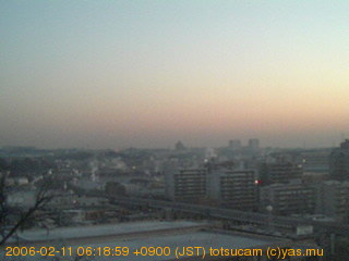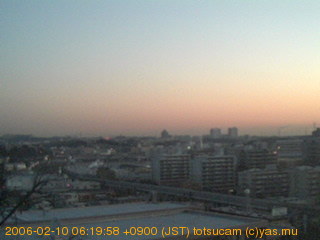 横浜市戸塚駅周辺から 東戸塚方面(北北東)を望む展望カメラの映像です。 左は現在の映像です。 下に並んでいるのは、 7日間に亘る日の出どき、昼間、夕暮れどきの写真(サムネイル)です。 それぞれ、日の出15分前、南中時、日没20分後の写真となっています。 各写真の下にはmpeg形式の動画へのリンクがあります。 それぞれ、日の出、南中、日没の前後1時間の画像です。 右欄にはその日24時間の動画へのリンクがあります。 この7日間以外は日付が一覧表示されています。 日付部分をクリックすると、 その日付から7日分が展開されて表示されます。