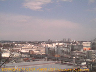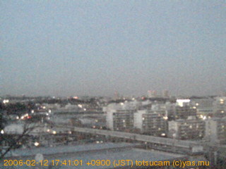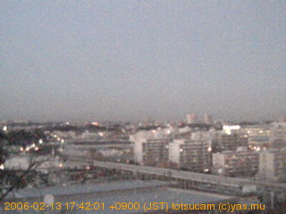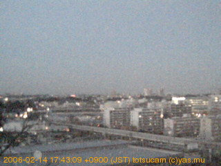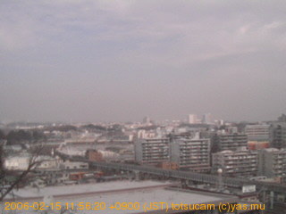 適度に曇った日の雲の動き (例: 2005-10-24) がとても楽しめます。 正面を横切っている高架は横須賀線下りです。 その下に横須賀線上り、東海道線、同貨物線が走っていますが、 高架に隠れていてよく見えません。 夜間は特に中央左寄りの車の動きがよく見えます。