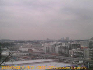 適度に曇った日の雲の動き (例: 2005-10-24) がとても楽しめます。 正面を横切っている高架は横須賀線下りです。 その下に横須賀線上り、東海道線、同貨物線が走っていますが、 高架に隠れていてよく見えません。 夜間は特に中央左寄りの車の動きがよく見えます。