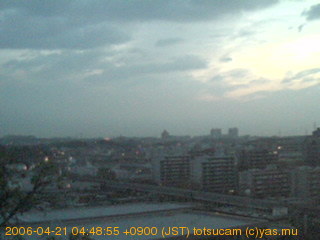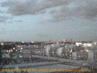 適度に曇った日の雲の動き (例: 2005-10-24) がとても楽しめます。 正面を横切っている高架は横須賀線下りです。 その下に横須賀線上り、東海道線、同貨物線が走っていますが、 高架に隠れていてよく見えません。 夜間は特に中央左寄りの車の動きがよく見えます。
