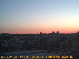 横浜市戸塚駅周辺から 東戸塚方面(北北東)を望む展望カメラの映像です。 左は現在の映像です。 下に並んでいるのは、 7日間に亘る日の出どき、昼間、夕暮れどきの写真(サムネイル)です。 それぞれ、日の出15分前、南中時、日没20分後の写真となっています。 各写真の下にはmpeg形式の動画へのリンクがあります。 それぞれ、日の出、南中、日没の前後1時間の画像です。 右欄にはその日24時間の動画へのリンクがあります。 この7日間以外は日付が一覧表示されています。 日付部分をクリックすると、 その日付から7日分が展開されて表示されます。