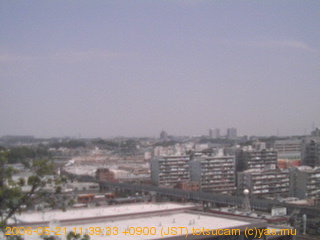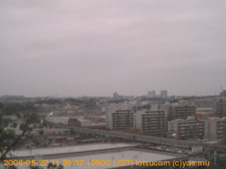 適度に曇った日の雲の動き (例: 2005-10-24) がとても楽しめます。 正面を横切っている高架は横須賀線下りです。 その下に横須賀線上り、東海道線、同貨物線が走っていますが、 高架に隠れていてよく見えません。 夜間は特に中央左寄りの車の動きがよく見えます。
