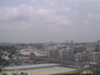 適度に曇った日の雲の動き (例: 2005-10-24) がとても楽しめます。 正面を横切っている高架は横須賀線下りです。 その下に横須賀線上り、東海道線、同貨物線が走っていますが、 高架に隠れていてよく見えません。 夜間は特に中央左寄りの車の動きがよく見えます。