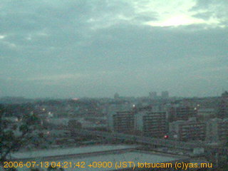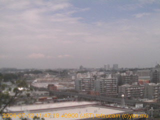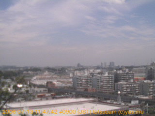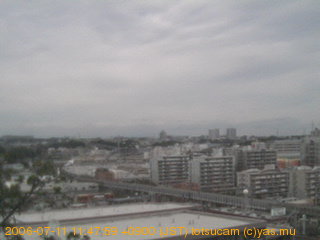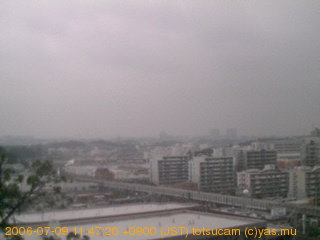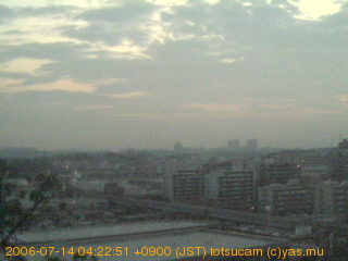 適度に曇った日の雲の動き (例: 2005-10-24) がとても楽しめます。 正面を横切っている高架は横須賀線下りです。 その下に横須賀線上り、東海道線、同貨物線が走っていますが、 高架に隠れていてよく見えません。 夜間は特に中央左寄りの車の動きがよく見えます。