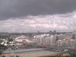 適度に曇った日の雲の動き (例: 2005-10-24) がとても楽しめます。 正面を横切っている高架は横須賀線下りです。 その下に横須賀線上り、東海道線、同貨物線が走っていますが、 高架に隠れていてよく見えません。 夜間は特に中央左寄りの車の動きがよく見えます。