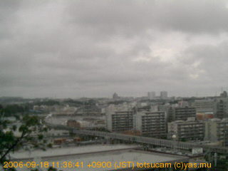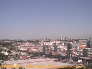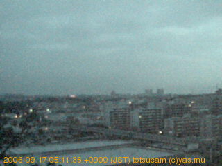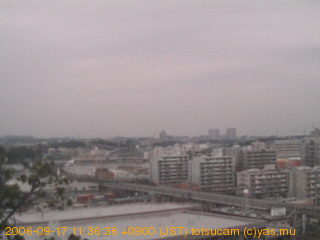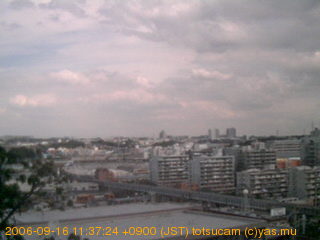 適度に曇った日の雲の動き (例: 2005-10-24) がとても楽しめます。 正面を横切っている高架は横須賀線下りです。 その下に横須賀線上り、東海道線、同貨物線が走っていますが、 高架に隠れていてよく見えません。 夜間は特に中央左寄りの車の動きがよく見えます。