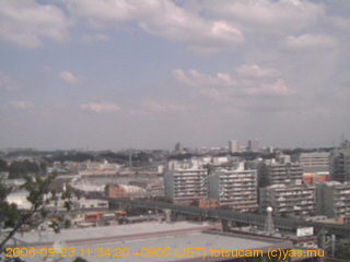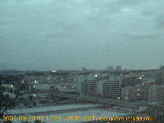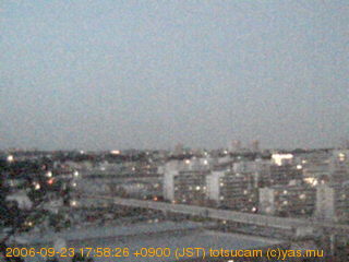 適度に曇った日の雲の動き (例: 2005-10-24) がとても楽しめます。 正面を横切っている高架は横須賀線下りです。 その下に横須賀線上り、東海道線、同貨物線が走っていますが、 高架に隠れていてよく見えません。 夜間は特に中央左寄りの車の動きがよく見えます。