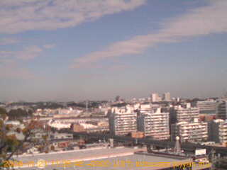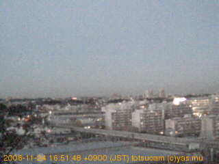 適度に曇った日の雲の動き (例: 2005-10-24) がとても楽しめます。 正面を横切っている高架は横須賀線下りです。 その下に横須賀線上り、東海道線、同貨物線が走っていますが、 高架に隠れていてよく見えません。 夜間は特に中央左寄りの車の動きがよく見えます。