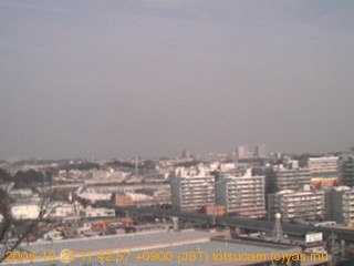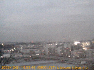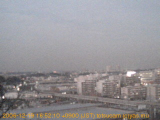 適度に曇った日の雲の動き (例: 2005-10-24) がとても楽しめます。 正面を横切っている高架は横須賀線下りです。 その下に横須賀線上り、東海道線、同貨物線が走っていますが、 高架に隠れていてよく見えません。 夜間は特に中央左寄りの車の動きがよく見えます。