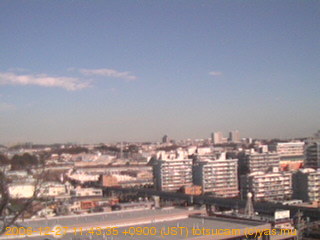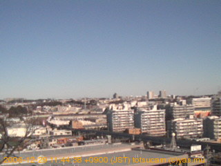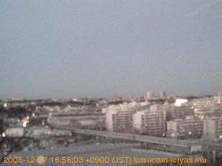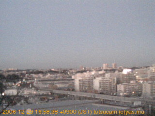 適度に曇った日の雲の動き (例: 2005-10-24) がとても楽しめます。 正面を横切っている高架は横須賀線下りです。 その下に横須賀線上り、東海道線、同貨物線が走っていますが、 高架に隠れていてよく見えません。 夜間は特に中央左寄りの車の動きがよく見えます。