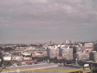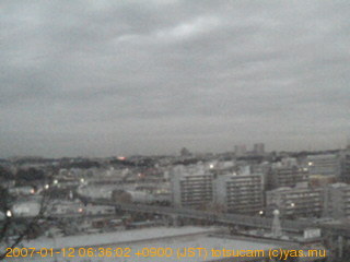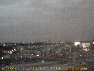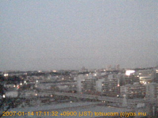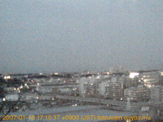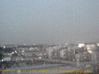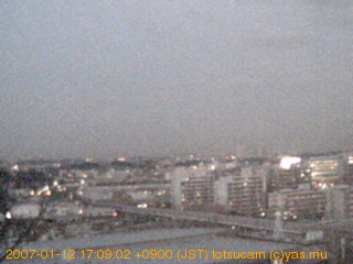 適度に曇った日の雲の動き (例: 2005-10-24) がとても楽しめます。 正面を横切っている高架は横須賀線下りです。 その下に横須賀線上り、東海道線、同貨物線が走っていますが、 高架に隠れていてよく見えません。 夜間は特に中央左寄りの車の動きがよく見えます。