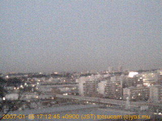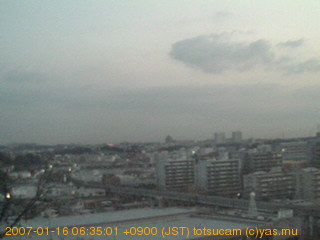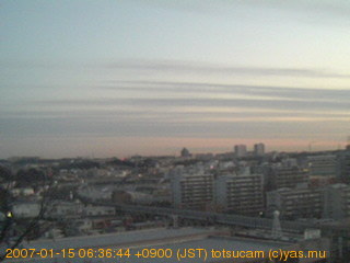 横浜市戸塚駅周辺から 東戸塚方面(北北東)を望む展望カメラの映像です。 左は現在の映像です。 下に並んでいるのは、 7日間に亘る日の出どき、昼間、夕暮れどきの写真(サムネイル)です。 それぞれ、日の出15分前、南中時、日没20分後の写真となっています。 各写真の下にはmpeg形式の動画へのリンクがあります。 それぞれ、日の出、南中、日没の前後1時間の画像です。 右欄にはその日24時間の動画へのリンクがあります。 この7日間以外は日付が一覧表示されています。 日付部分をクリックすると、 その日付から7日分が展開されて表示されます。
