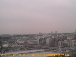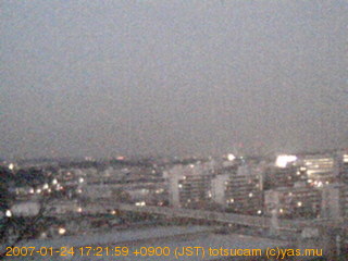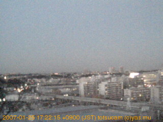 適度に曇った日の雲の動き (例: 2005-10-24) がとても楽しめます。 正面を横切っている高架は横須賀線下りです。 その下に横須賀線上り、東海道線、同貨物線が走っていますが、 高架に隠れていてよく見えません。 夜間は特に中央左寄りの車の動きがよく見えます。