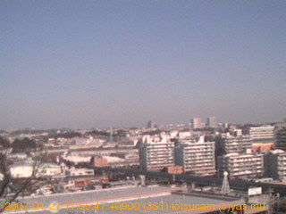 適度に曇った日の雲の動き (例: 2005-10-24) がとても楽しめます。 正面を横切っている高架は横須賀線下りです。 その下に横須賀線上り、東海道線、同貨物線が走っていますが、 高架に隠れていてよく見えません。 夜間は特に中央左寄りの車の動きがよく見えます。