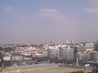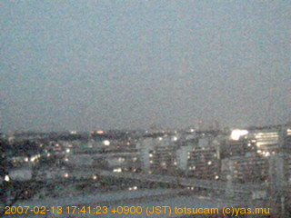 適度に曇った日の雲の動き (例: 2005-10-24) がとても楽しめます。 正面を横切っている高架は横須賀線下りです。 その下に横須賀線上り、東海道線、同貨物線が走っていますが、 高架に隠れていてよく見えません。 夜間は特に中央左寄りの車の動きがよく見えます。