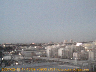 適度に曇った日の雲の動き (例: 2005-10-24) がとても楽しめます。 正面を横切っている高架は横須賀線下りです。 その下に横須賀線上り、東海道線、同貨物線が走っていますが、 高架に隠れていてよく見えません。 夜間は特に中央左寄りの車の動きがよく見えます。