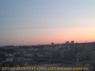 横浜市戸塚駅周辺から 東戸塚方面(北北東)を望む展望カメラの映像です。 左は現在の映像です。 下に並んでいるのは、 7日間に亘る日の出どき、昼間、夕暮れどきの写真(サムネイル)です。 それぞれ、日の出15分前、南中時、日没20分後の写真となっています。 各写真の下にはmpeg形式の動画へのリンクがあります。 それぞれ、日の出、南中、日没の前後1時間の画像です。 右欄にはその日24時間の動画へのリンクがあります。 この7日間以外は日付が一覧表示されています。 日付部分をクリックすると、 その日付から7日分が展開されて表示されます。