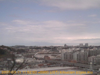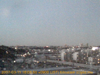 適度に曇った日の雲の動き (例: 2005-10-24) がとても楽しめます。 正面を横切っている高架は横須賀線下りです。 その下に横須賀線上り、東海道線、同貨物線が走っていますが、 高架に隠れていてよく見えません。 夜間は特に中央左寄りの車の動きがよく見えます。