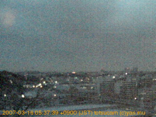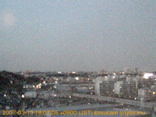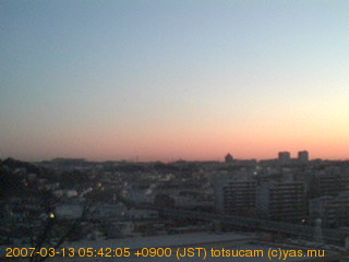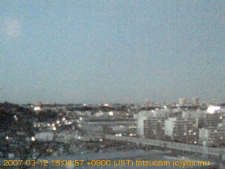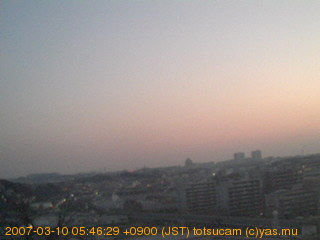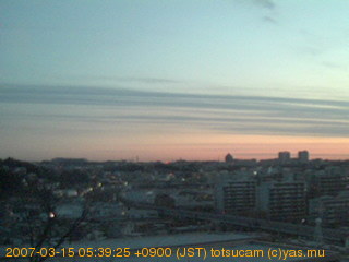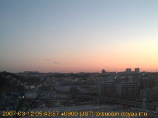 横浜市戸塚駅周辺から 東戸塚方面(北北東)を望む展望カメラの映像です。 左は現在の映像です。 下に並んでいるのは、 7日間に亘る日の出どき、昼間、夕暮れどきの写真(サムネイル)です。 それぞれ、日の出15分前、南中時、日没20分後の写真となっています。 各写真の下にはmpeg形式の動画へのリンクがあります。 それぞれ、日の出、南中、日没の前後1時間の画像です。 右欄にはその日24時間の動画へのリンクがあります。 この7日間以外は日付が一覧表示されています。 日付部分をクリックすると、 その日付から7日分が展開されて表示されます。