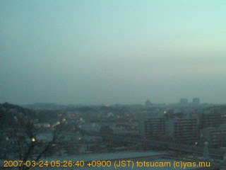 横浜市戸塚駅周辺から 東戸塚方面(北北東)を望む展望カメラの映像です。 左は現在の映像です。 下に並んでいるのは、 7日間に亘る日の出どき、昼間、夕暮れどきの写真(サムネイル)です。 それぞれ、日の出15分前、南中時、日没20分後の写真となっています。 各写真の下にはmpeg形式の動画へのリンクがあります。 それぞれ、日の出、南中、日没の前後1時間の画像です。 右欄にはその日24時間の動画へのリンクがあります。 この7日間以外は日付が一覧表示されています。 日付部分をクリックすると、 その日付から7日分が展開されて表示されます。