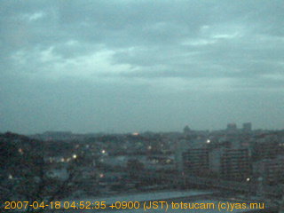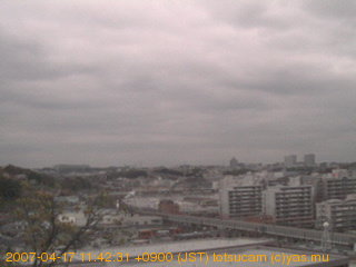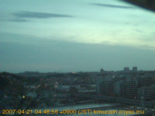 適度に曇った日の雲の動き (例: 2005-10-24) がとても楽しめます。 正面を横切っている高架は横須賀線下りです。 その下に横須賀線上り、東海道線、同貨物線が走っていますが、 高架に隠れていてよく見えません。 夜間は特に中央左寄りの車の動きがよく見えます。