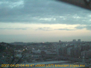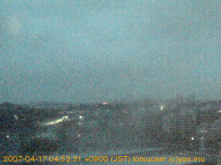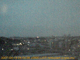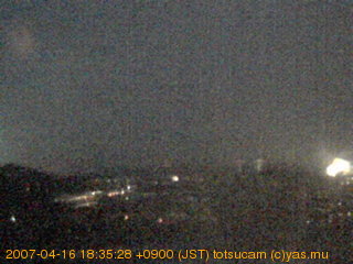 横浜市戸塚駅周辺から 東戸塚方面(北北東)を望む展望カメラの映像です。 左は現在の映像です。 下に並んでいるのは、 7日間に亘る日の出どき、昼間、夕暮れどきの写真(サムネイル)です。 それぞれ、日の出15分前、南中時、日没20分後の写真となっています。 各写真の下にはmpeg形式の動画へのリンクがあります。 それぞれ、日の出、南中、日没の前後1時間の画像です。 右欄にはその日24時間の動画へのリンクがあります。 この7日間以外は日付が一覧表示されています。 日付部分をクリックすると、 その日付から7日分が展開されて表示されます。