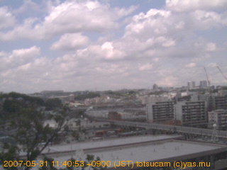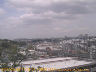 適度に曇った日の雲の動き (例: 2005-10-24) がとても楽しめます。 正面を横切っている高架は横須賀線下りです。 その下に横須賀線上り、東海道線、同貨物線が走っていますが、 高架に隠れていてよく見えません。 夜間は特に中央左寄りの車の動きがよく見えます。