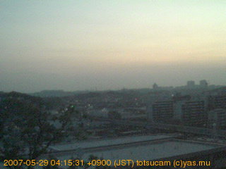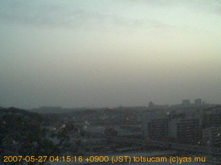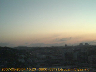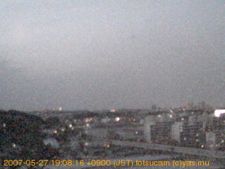 横浜市戸塚駅周辺から 東戸塚方面(北北東)を望む展望カメラの映像です。 左は現在の映像です。 下に並んでいるのは、 7日間に亘る日の出どき、昼間、夕暮れどきの写真(サムネイル)です。 それぞれ、日の出15分前、南中時、日没20分後の写真となっています。 各写真の下にはmpeg形式の動画へのリンクがあります。 それぞれ、日の出、南中、日没の前後1時間の画像です。 右欄にはその日24時間の動画へのリンクがあります。 この7日間以外は日付が一覧表示されています。 日付部分をクリックすると、 その日付から7日分が展開されて表示されます。
