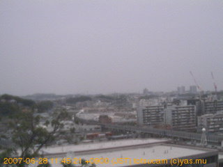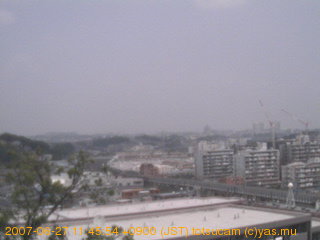 適度に曇った日の雲の動き (例: 2005-10-24) がとても楽しめます。 正面を横切っている高架は横須賀線下りです。 その下に横須賀線上り、東海道線、同貨物線が走っていますが、 高架に隠れていてよく見えません。 夜間は特に中央左寄りの車の動きがよく見えます。