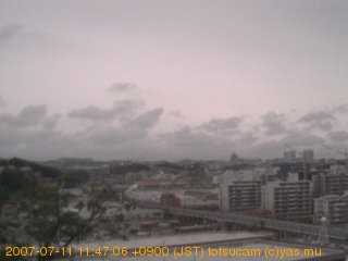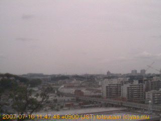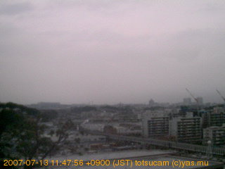 適度に曇った日の雲の動き (例: 2005-10-24) がとても楽しめます。 正面を横切っている高架は横須賀線下りです。 その下に横須賀線上り、東海道線、同貨物線が走っていますが、 高架に隠れていてよく見えません。 夜間は特に中央左寄りの車の動きがよく見えます。