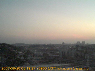 横浜市戸塚駅周辺から 東戸塚方面(北北東)を望む展望カメラの映像です。 左は現在の映像です。 下に並んでいるのは、 7日間に亘る日の出どき、昼間、夕暮れどきの写真(サムネイル)です。 それぞれ、日の出15分前、南中時、日没20分後の写真となっています。 各写真の下にはmpeg形式の動画へのリンクがあります。 それぞれ、日の出、南中、日没の前後1時間の画像です。 右欄にはその日24時間の動画へのリンクがあります。 この7日間以外は日付が一覧表示されています。 日付部分をクリックすると、 その日付から7日分が展開されて表示されます。