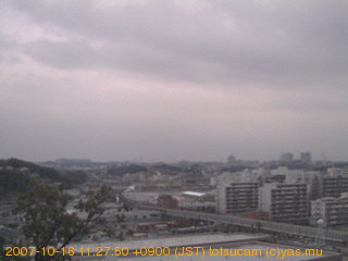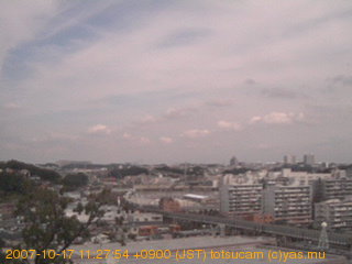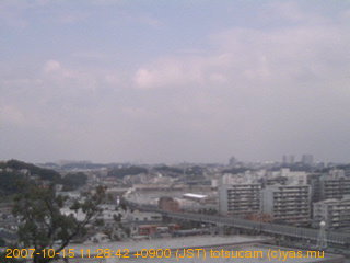 適度に曇った日の雲の動き (例: 2005-10-24) がとても楽しめます。 正面を横切っている高架は横須賀線下りです。 その下に横須賀線上り、東海道線、同貨物線が走っていますが、 高架に隠れていてよく見えません。 夜間は特に中央左寄りの車の動きがよく見えます。