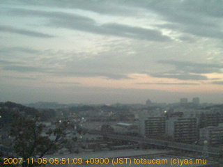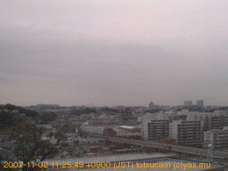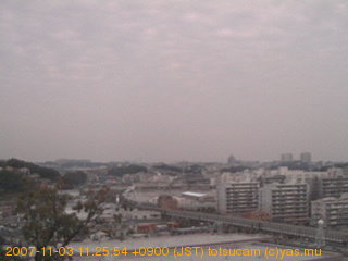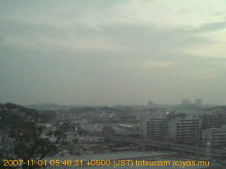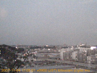 適度に曇った日の雲の動き (例: 2005-10-24) がとても楽しめます。 正面を横切っている高架は横須賀線下りです。 その下に横須賀線上り、東海道線、同貨物線が走っていますが、 高架に隠れていてよく見えません。 夜間は特に中央左寄りの車の動きがよく見えます。