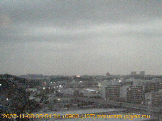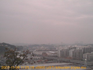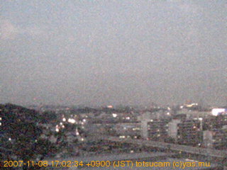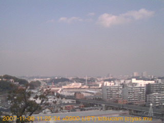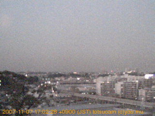 適度に曇った日の雲の動き (例: 2005-10-24) がとても楽しめます。 正面を横切っている高架は横須賀線下りです。 その下に横須賀線上り、東海道線、同貨物線が走っていますが、 高架に隠れていてよく見えません。 夜間は特に中央左寄りの車の動きがよく見えます。