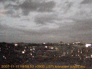 横浜市戸塚駅周辺から 東戸塚方面(北北東)を望む展望カメラの映像です。 左は現在の映像です。 下に並んでいるのは、 7日間に亘る日の出どき、昼間、夕暮れどきの写真(サムネイル)です。 それぞれ、日の出15分前、南中時、日没20分後の写真となっています。 各写真の下にはmpeg形式の動画へのリンクがあります。 それぞれ、日の出、南中、日没の前後1時間の画像です。 右欄にはその日24時間の動画へのリンクがあります。 この7日間以外は日付が一覧表示されています。 日付部分をクリックすると、 その日付から7日分が展開されて表示されます。