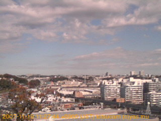 適度に曇った日の雲の動き (例: 2005-10-24) がとても楽しめます。 正面を横切っている高架は横須賀線下りです。 その下に横須賀線上り、東海道線、同貨物線が走っていますが、 高架に隠れていてよく見えません。 夜間は特に中央左寄りの車の動きがよく見えます。