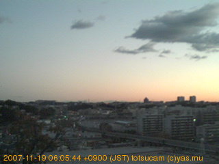 横浜市戸塚駅周辺から 東戸塚方面(北北東)を望む展望カメラの映像です。 左は現在の映像です。 下に並んでいるのは、 7日間に亘る日の出どき、昼間、夕暮れどきの写真(サムネイル)です。 それぞれ、日の出15分前、南中時、日没20分後の写真となっています。 各写真の下にはmpeg形式の動画へのリンクがあります。 それぞれ、日の出、南中、日没の前後1時間の画像です。 右欄にはその日24時間の動画へのリンクがあります。 この7日間以外は日付が一覧表示されています。 日付部分をクリックすると、 その日付から7日分が展開されて表示されます。