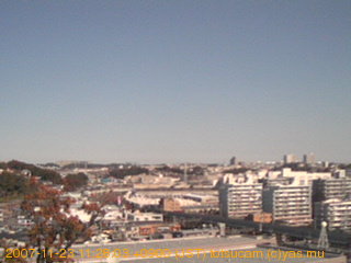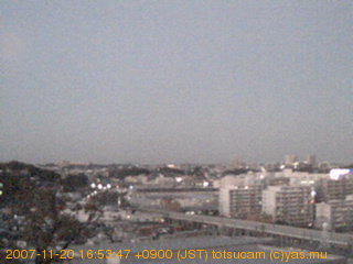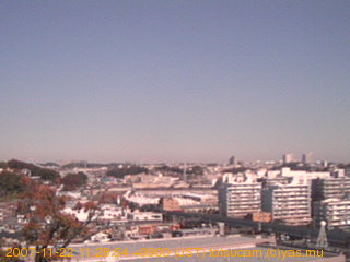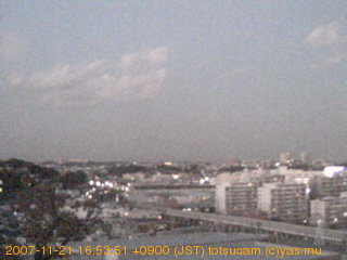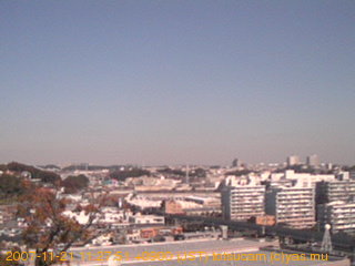 適度に曇った日の雲の動き (例: 2005-10-24) がとても楽しめます。 正面を横切っている高架は横須賀線下りです。 その下に横須賀線上り、東海道線、同貨物線が走っていますが、 高架に隠れていてよく見えません。 夜間は特に中央左寄りの車の動きがよく見えます。