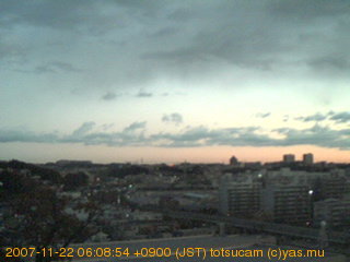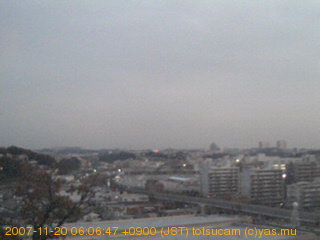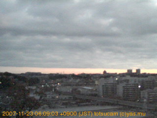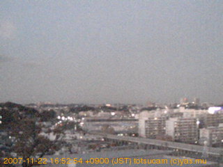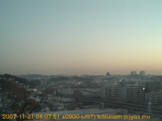 横浜市戸塚駅周辺から 東戸塚方面(北北東)を望む展望カメラの映像です。 左は現在の映像です。 下に並んでいるのは、 7日間に亘る日の出どき、昼間、夕暮れどきの写真(サムネイル)です。 それぞれ、日の出15分前、南中時、日没20分後の写真となっています。 各写真の下にはmpeg形式の動画へのリンクがあります。 それぞれ、日の出、南中、日没の前後1時間の画像です。 右欄にはその日24時間の動画へのリンクがあります。 この7日間以外は日付が一覧表示されています。 日付部分をクリックすると、 その日付から7日分が展開されて表示されます。