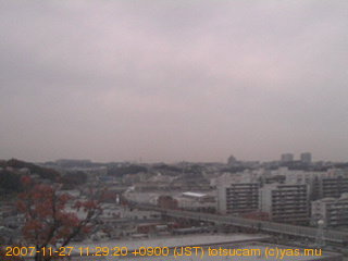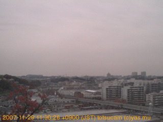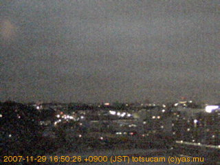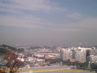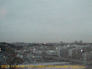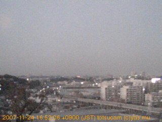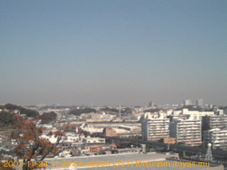 適度に曇った日の雲の動き (例: 2005-10-24) がとても楽しめます。 正面を横切っている高架は横須賀線下りです。 その下に横須賀線上り、東海道線、同貨物線が走っていますが、 高架に隠れていてよく見えません。 夜間は特に中央左寄りの車の動きがよく見えます。